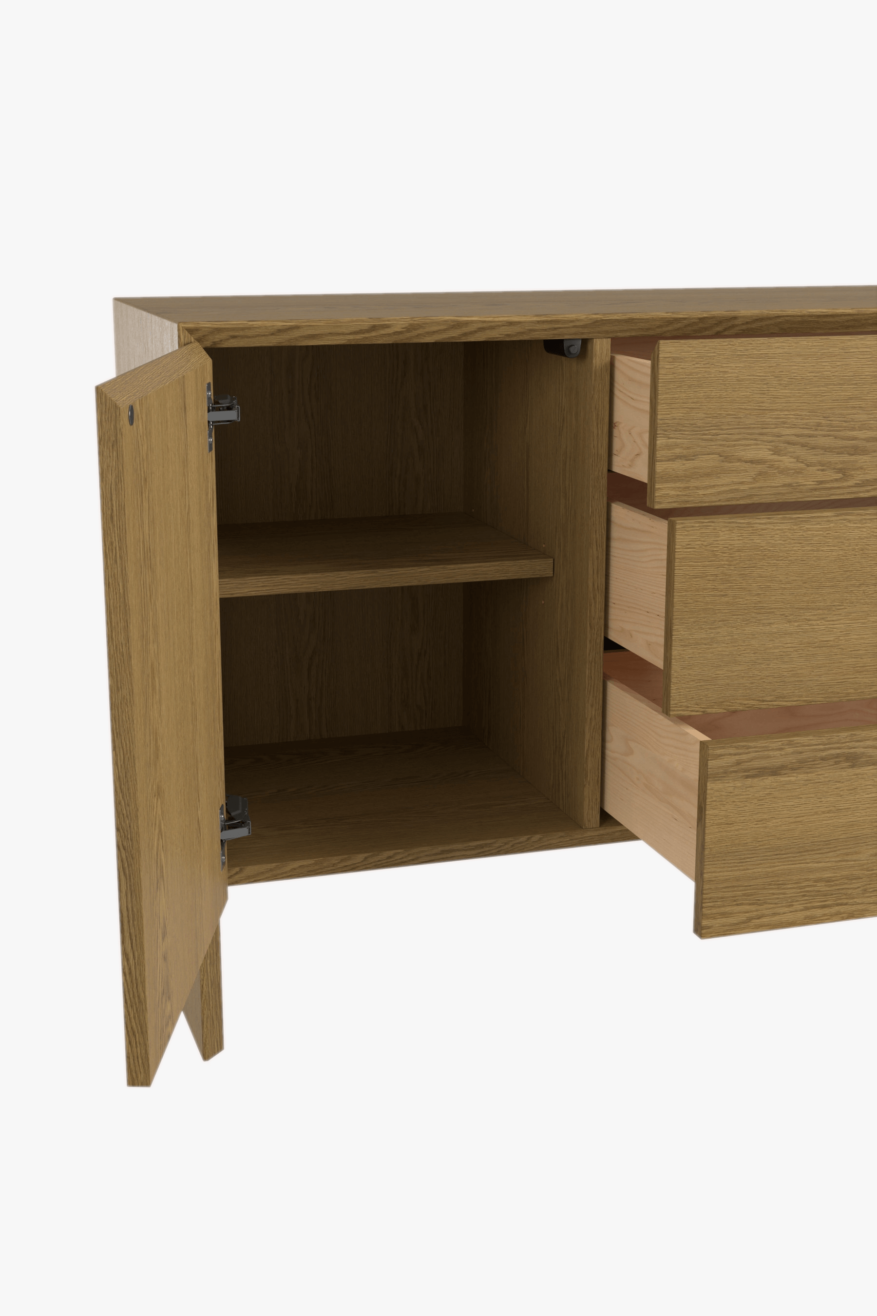 The Laura Ashley Ammanford 2 Door 3 Drawer Sideboard exemplifies a minimal modern design with clever but subtle features. The arched frame is chamfered back but then cleverly overlapped by the doors and drawers, which appear to float in front. To maintain minimal and clean lines, the drawers can be opened with push-latches made from a contrasting birch. Behind each push-latched door is an adjustable shelf.
