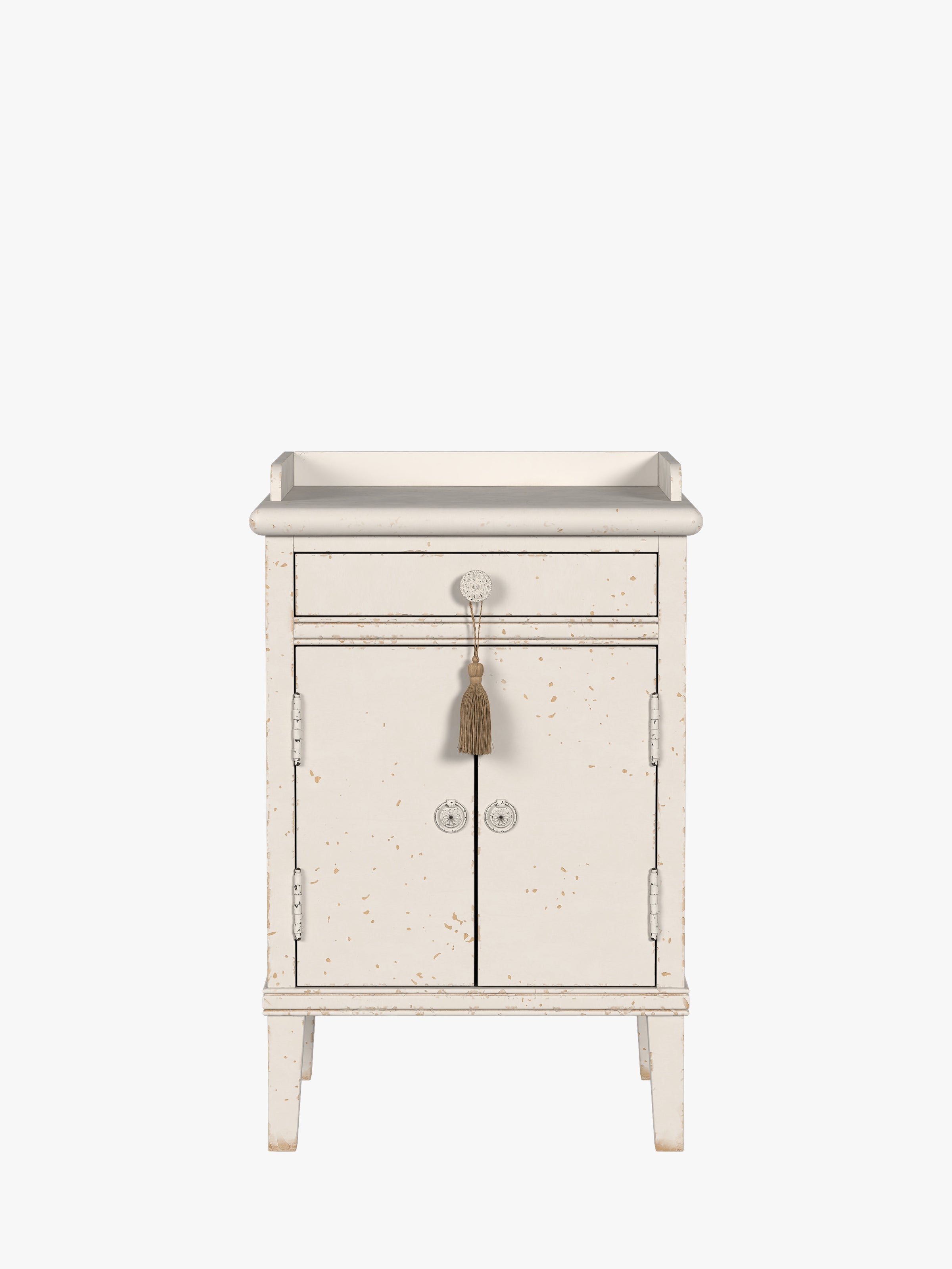 Timeless and romantic, the Laura Ashley Annaside 2 Door 1 Drawer Bedside Cabinet is the perfect addition to any bedroom. With a whimsical French flair, this gorgeous bedside table features offers plenty of space for your essentials and is finished with painted ring handles, a floral drawer knob and a decorative gold tassel. This cabinet features one drawer, along with a fixed shelf behind the beautifully crafted doors. Crafted from solid poplar, this piece features an antique white paint finish, carefully hand-distressed to provide the look of an heirloom piece.
