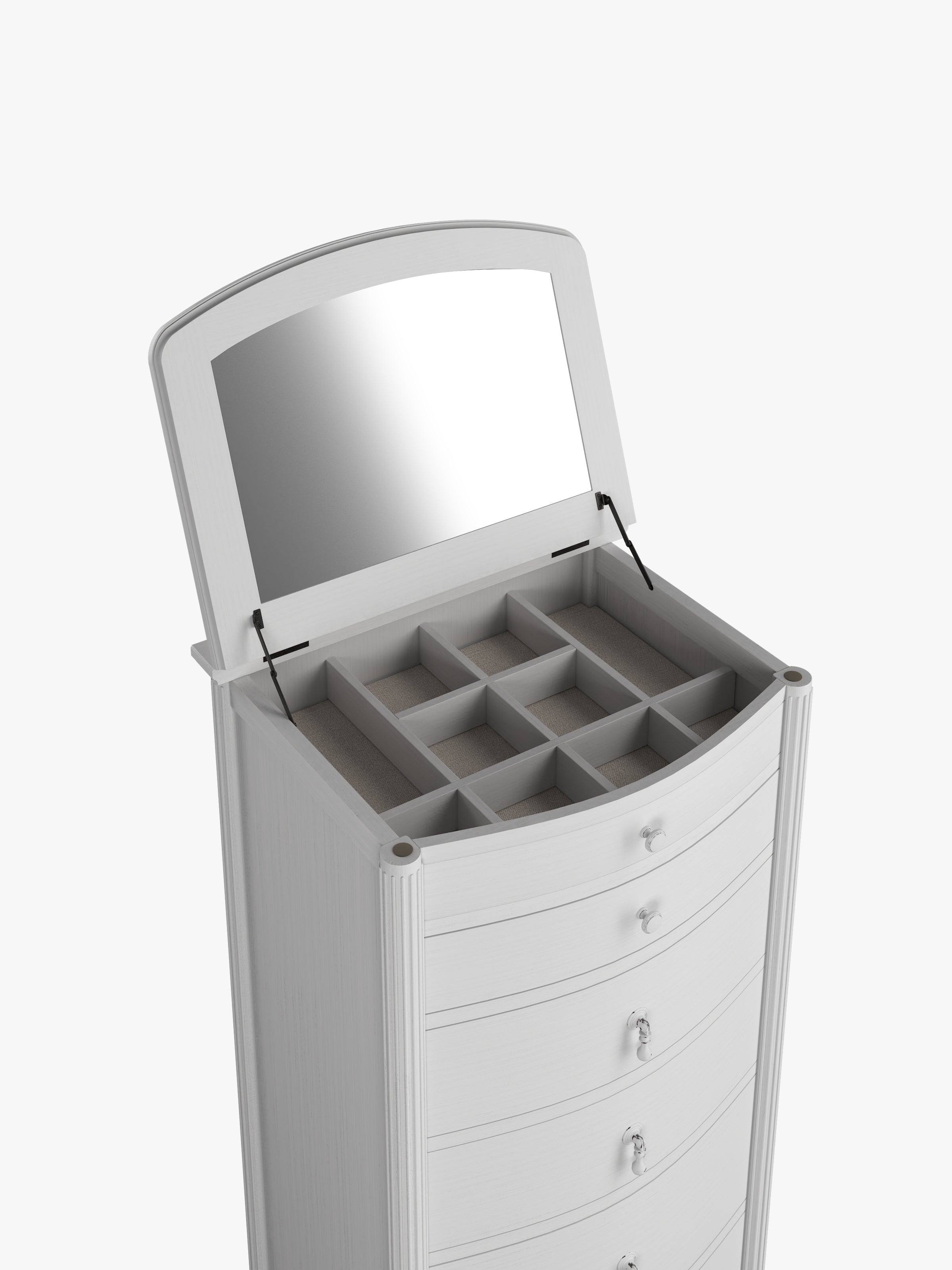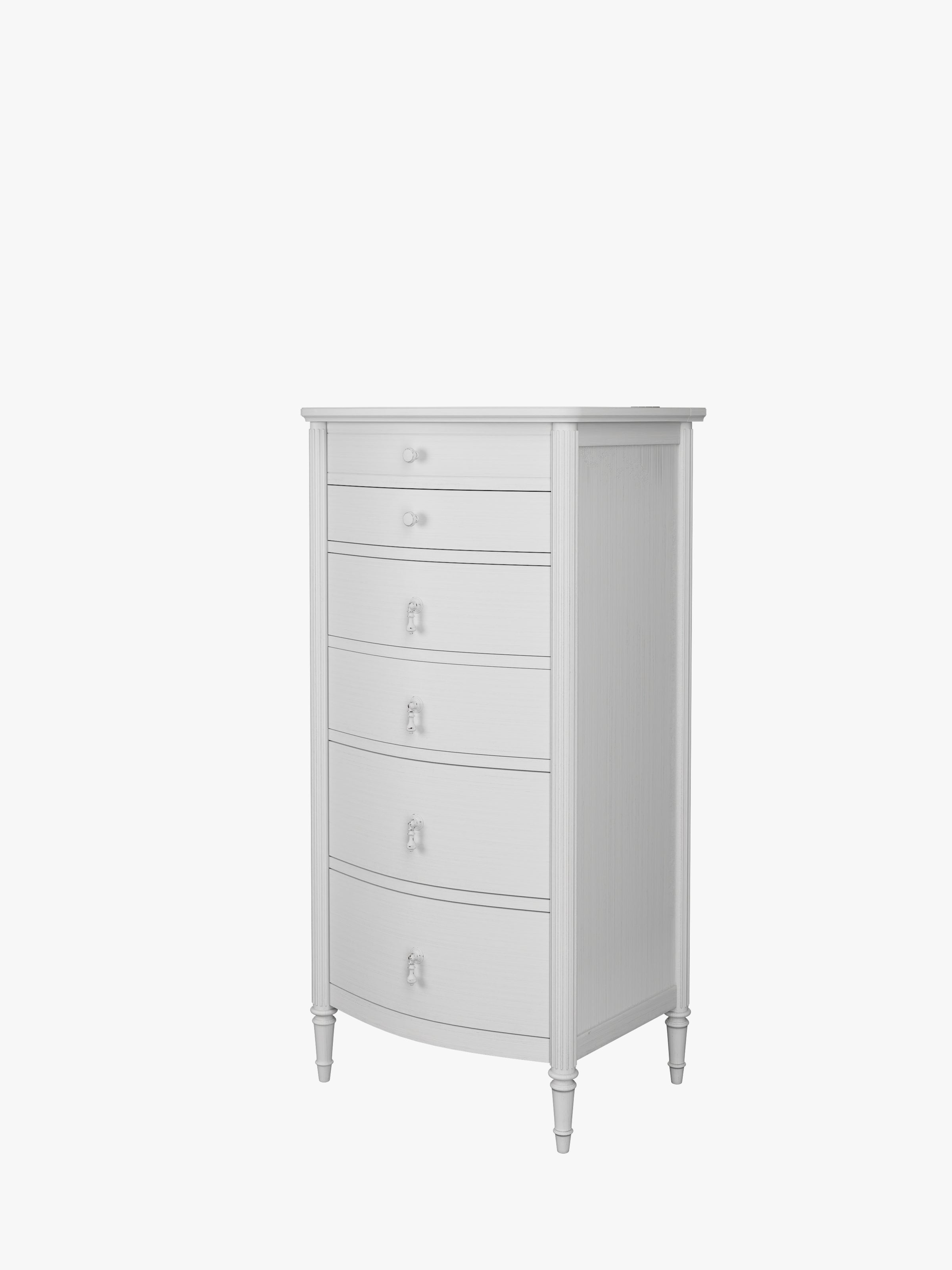 Timeless and elegant, the Laura Ashley Bramford 5 Drawer Tall Chest features characteristic reeded details and a washed finish. Bringing a sense of luxury to any home, this gorgeous piece features 5 spacious drawers and a lift-up storage top with an internal mirror.
