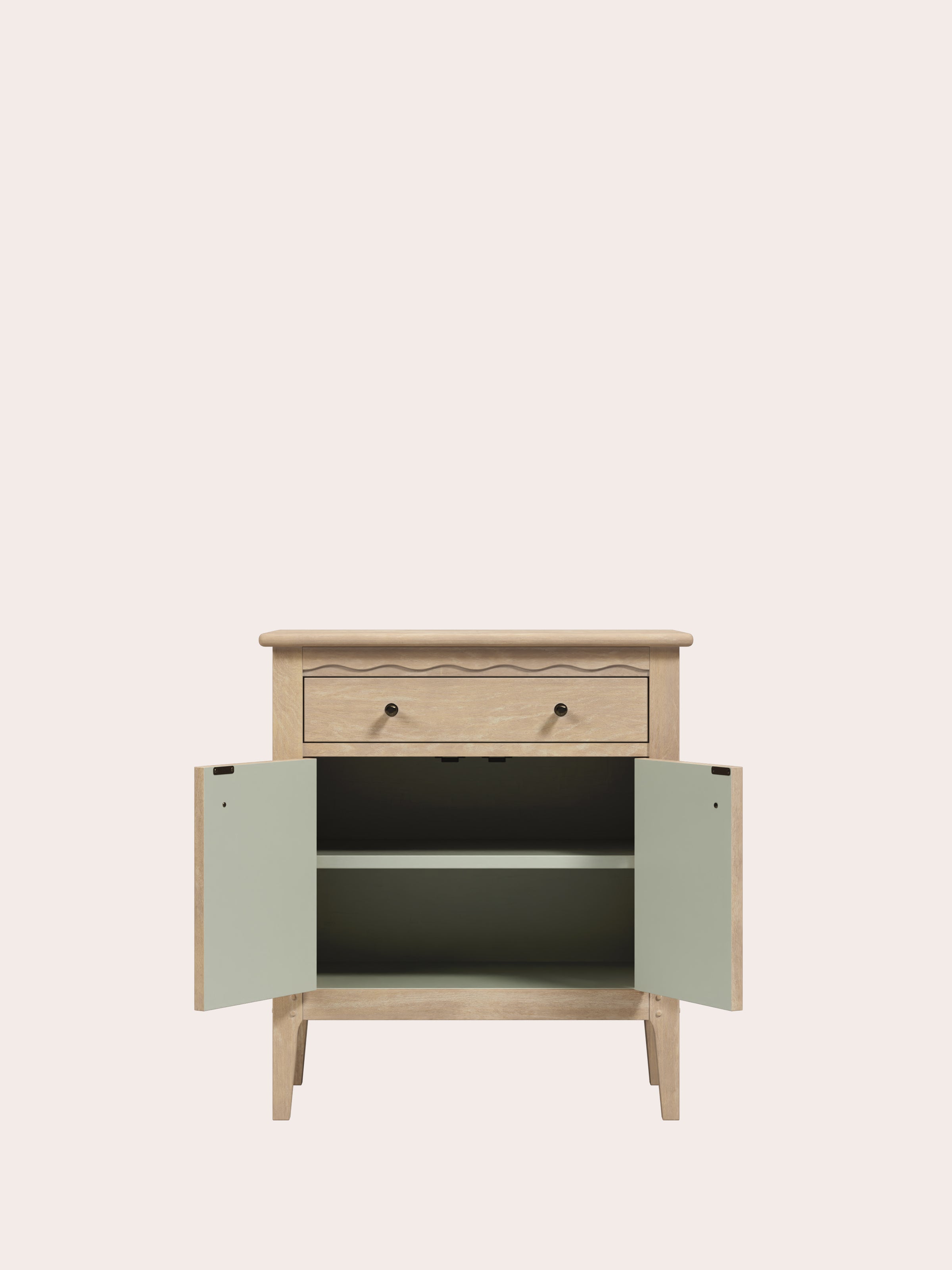 The Laura Ashley Calford 2 Door 1 Drawer Cabinet exudes charm and makes a perfect addition to your home. Inspired by Shaker style, this beautiful cabinet features scallop edge detailing and is crafted from natural oak and oak veneer with a white-washed finish. It offers plenty of storage space with a removable shelf in the lower cupboard and has one drawer on top. The interior is finished in the elegant Laura Ashley Sage Green paint, complemented by dark bronze droplet handles to complete the look.
