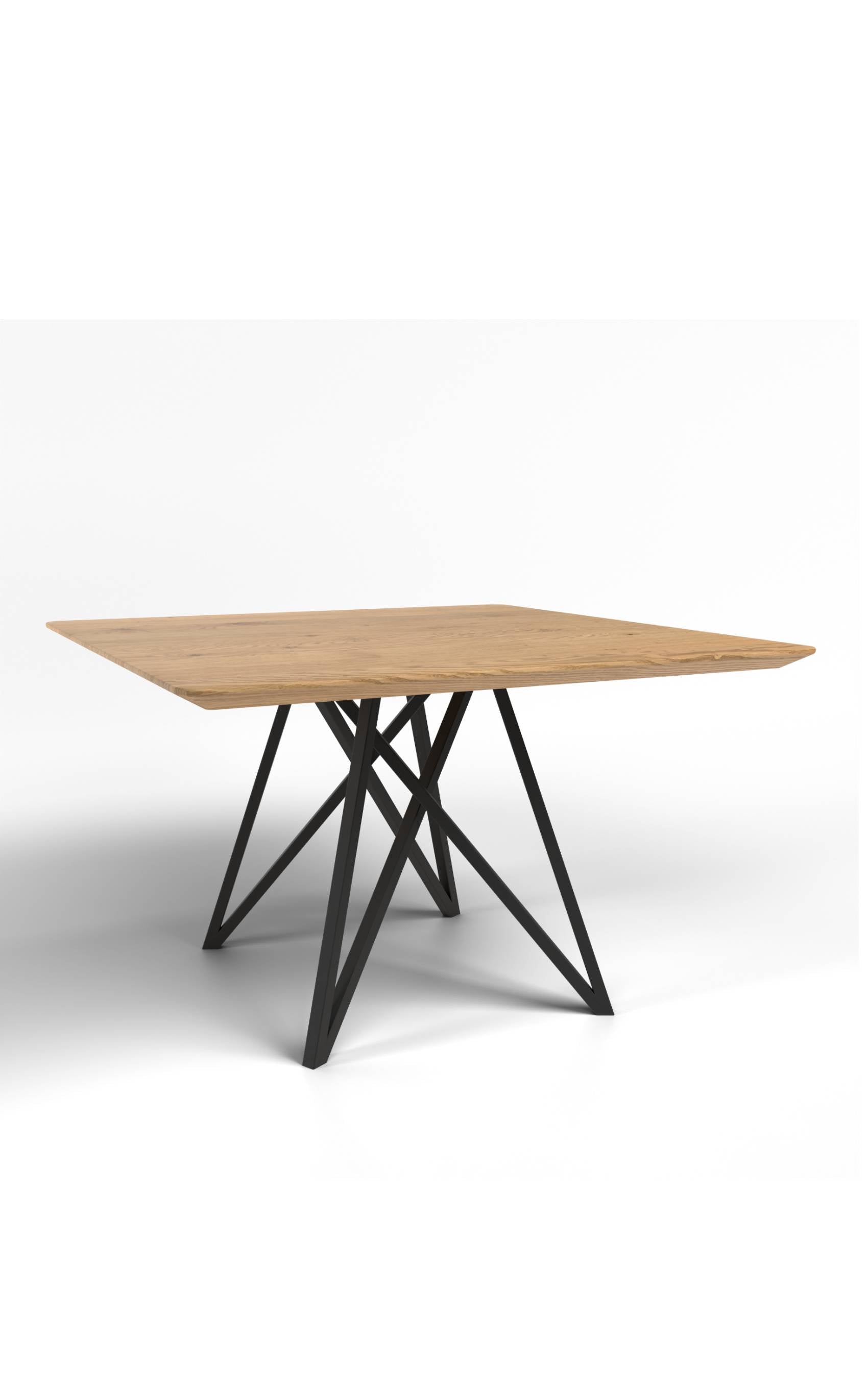 Modern dining table with a natural oak top and bold black metal base. The geometric design combines durability with contemporary style, making it a striking centerpiece for any dining space. Available in multiple wood finishes and edge options to suit your style.