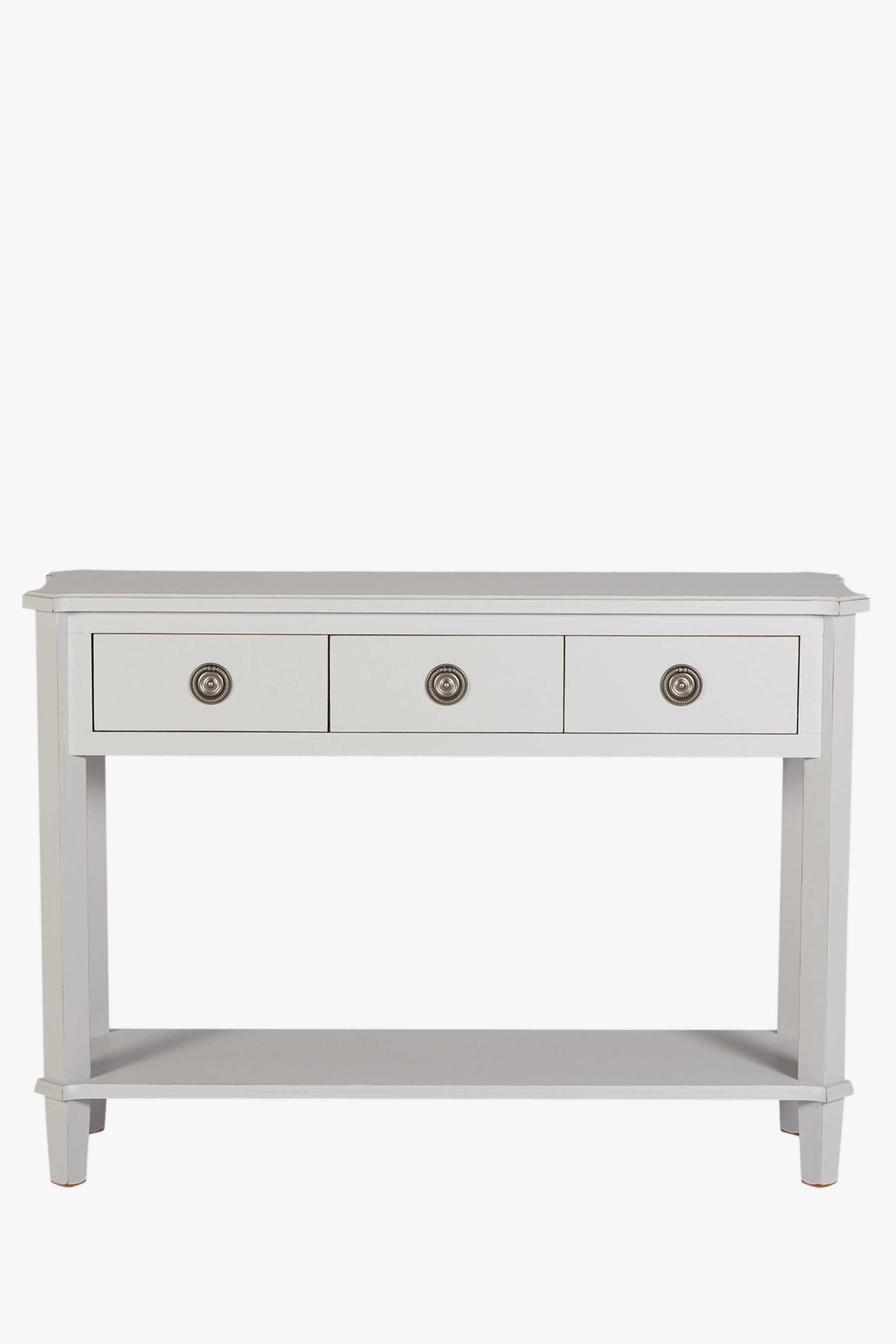 With its elegant design the Laura Ashley Henshaw 3 Drawer Console Table adds a touch of drama to any room in the home. With three drawers as well as a full width fixed lower shelf there is ample space for those treasured possessions. The table is crafted from solid wood as well as some veneered elements. It is expertly hand painted and is finished with a clear lacquer keeping maintenance to a minimum. The item has a gentle aged effect thanks to subtle distressing applied to the edges. Only the legs need to be attached to begin enjoying this piece; full assembly is not required.