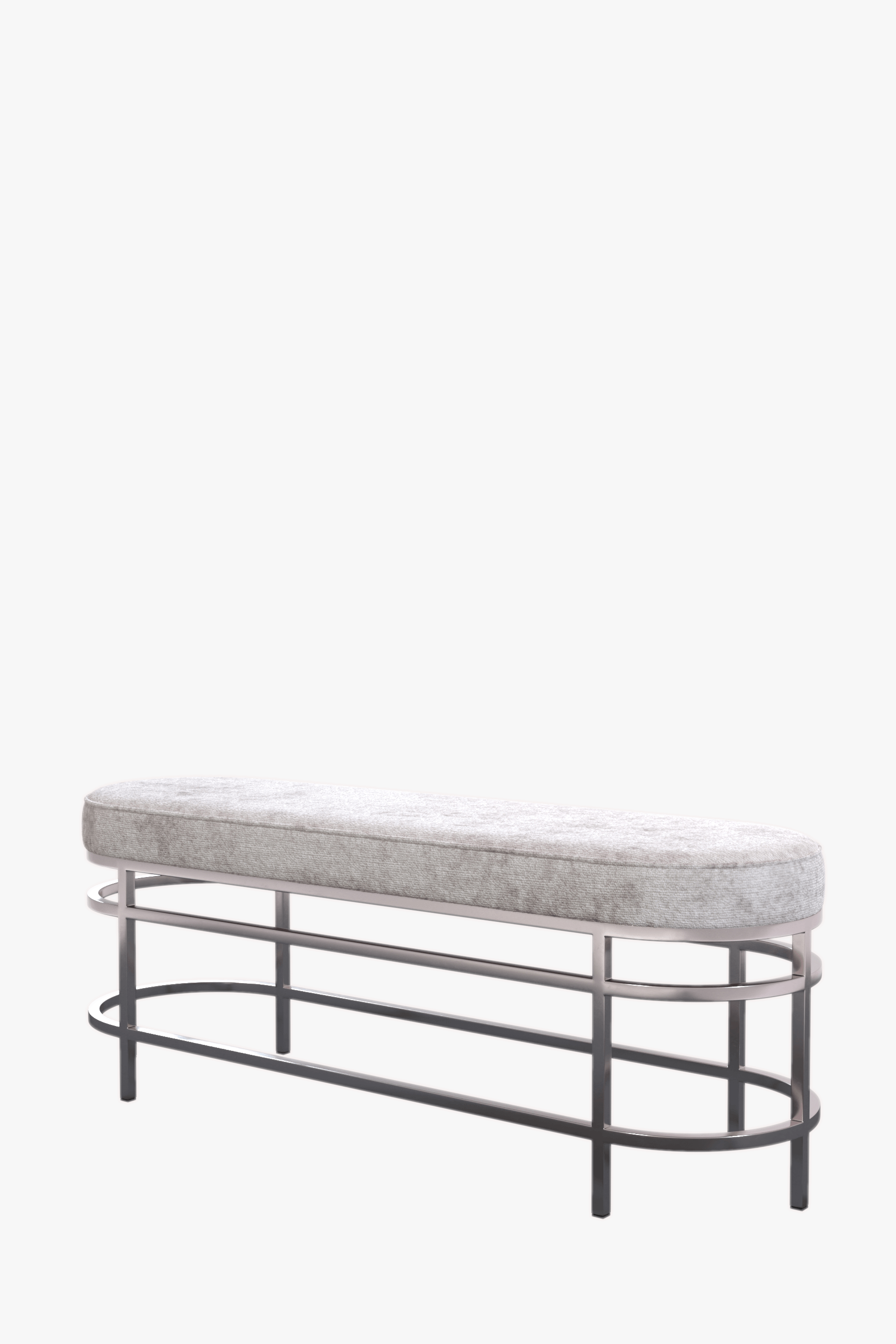 The design of Laura Ashley Pendine Bench 4'6" borrows from the Art-Deco movement with a modern twist of a satin nickel finish. It's designed to complement the elegant curves of the Pendine table range featuring the same guard-rail design. The bench is sized to fit the width of a standard UK double bed but is equally at home within a living room environment. The seat is upholstered with foam for resilience and fibre for comfort, covered with a luxurious, heavyweight chenille fabric. A pretty yet universal design, suitable for modern and classical interiors alike.