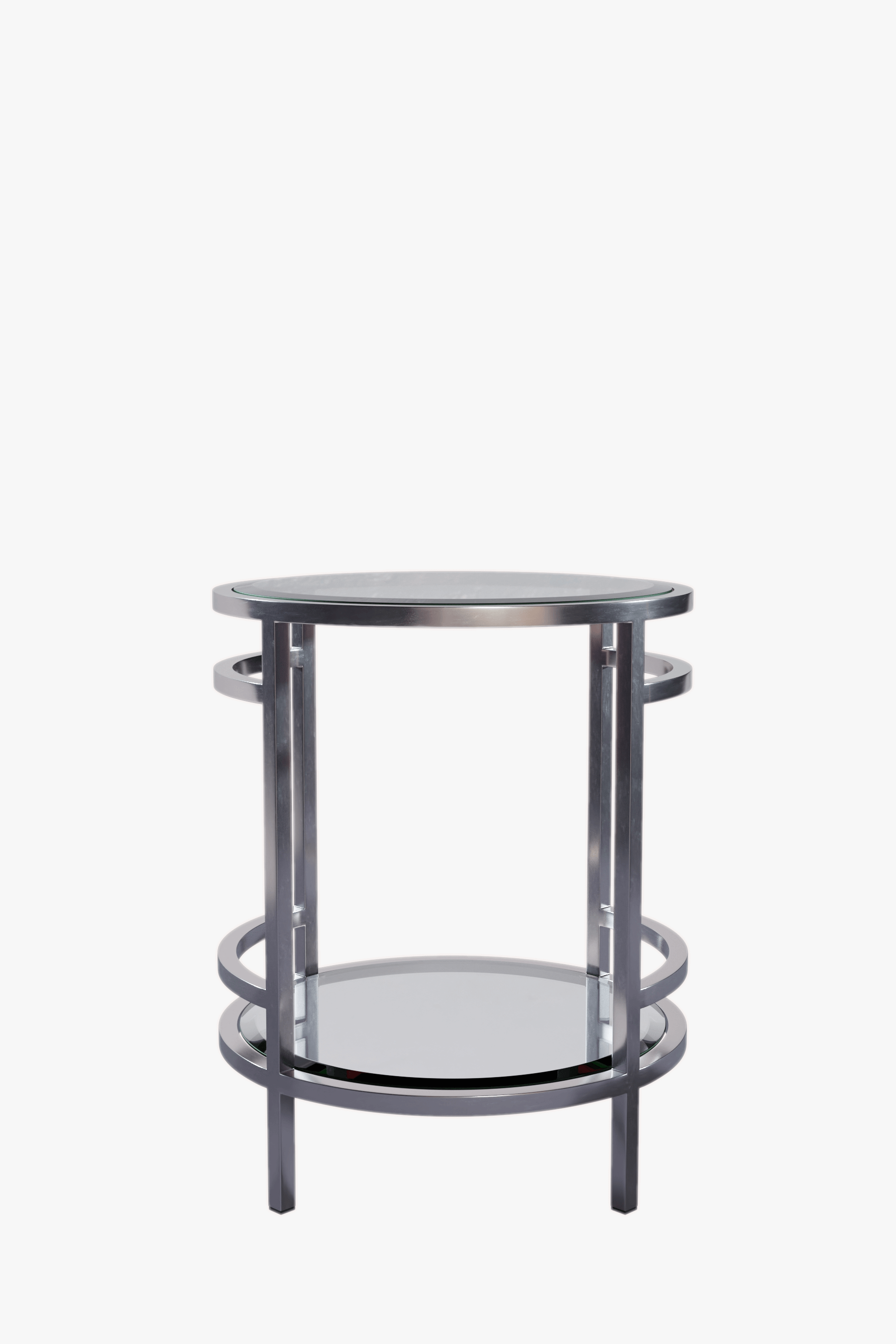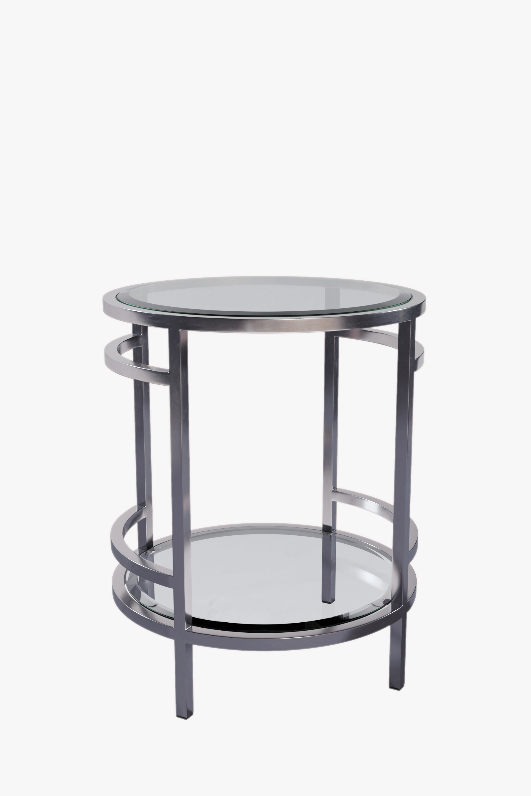 The design of Laura Ashley Pendine Side Table borrows from the Art-Deco but is realised in a modern satin nickel finish. Its glass top and lower shelf are elegantly bevelled to fit flush with the slender frame; a pretty yet universal design, suitable for modern and classical interiors alike.