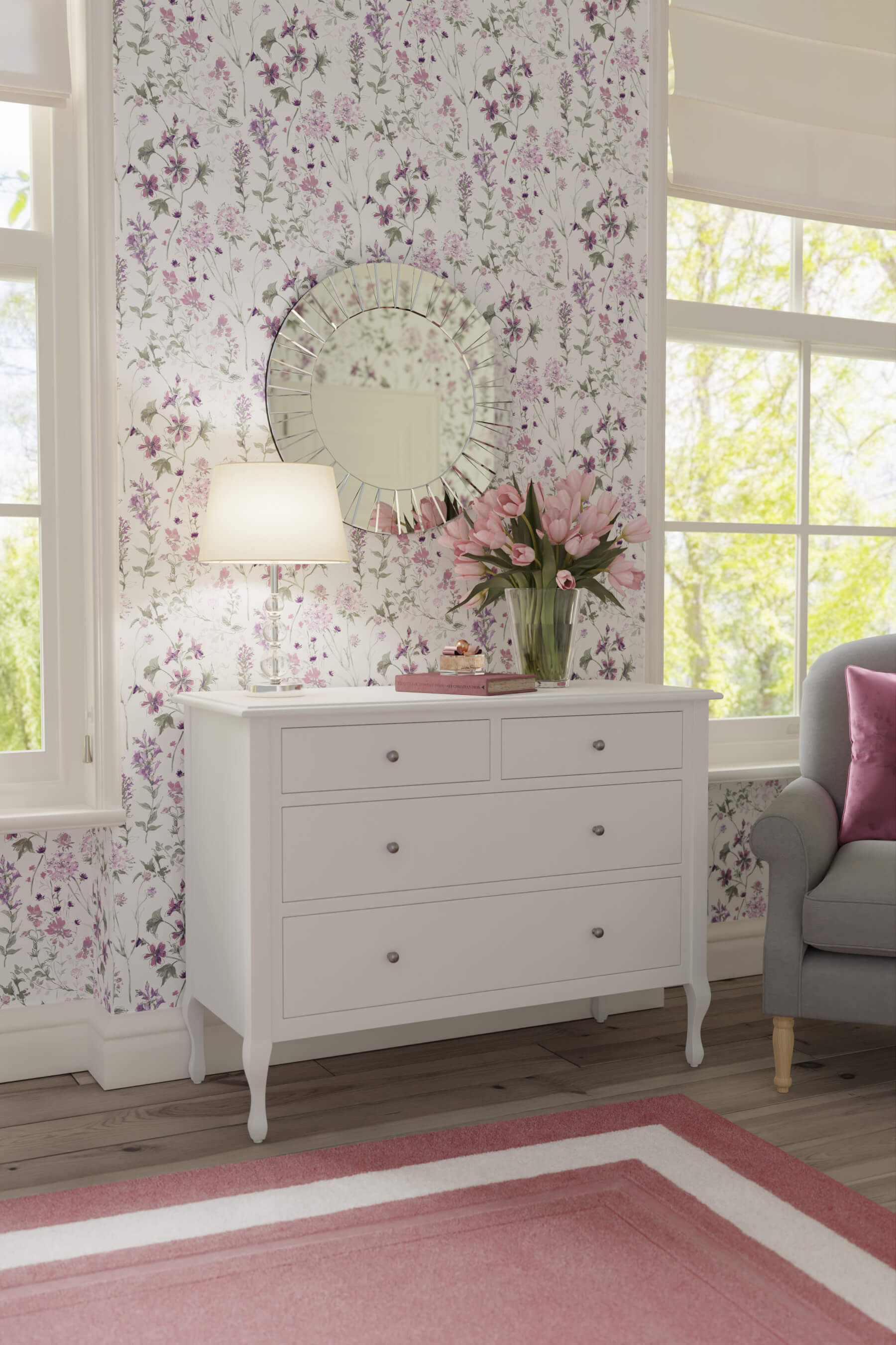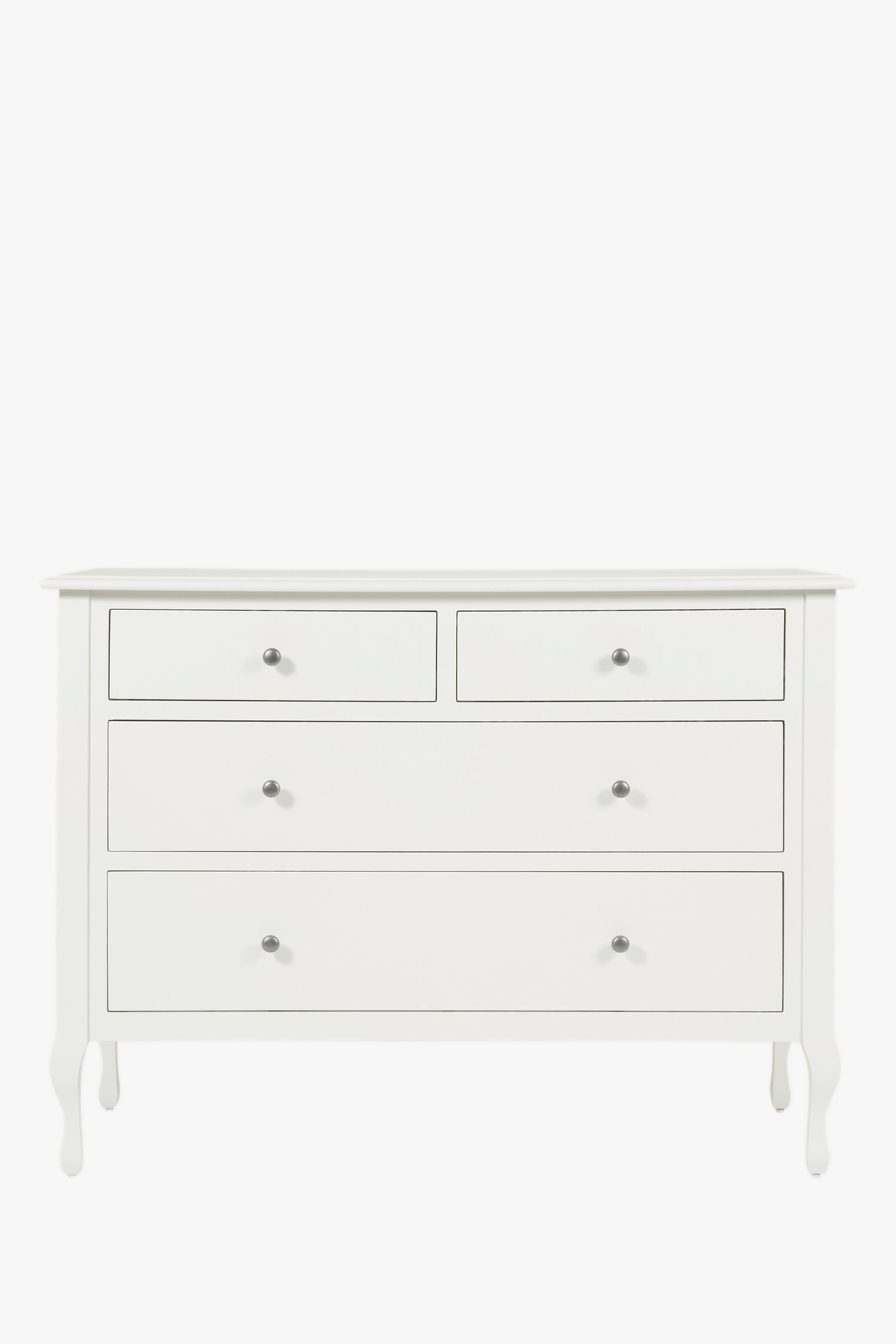 The Laura Ashley Rosalind 2+2 Drawer Chest continues the theme of French Rococo furniture with handsome proportions and elegant shaping but in a contemporary fashion. The chest features two adjacent narrow drawers above two deeper, full width drawers all dressed with pewter effect knobs, providing an attractive and practical configuration. The top is characterised with pretty bevelled edges and all surfaces are given a graceful yet durable painted finish.